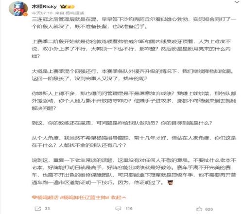 楊鳴指導還在個人社媒上致歉:最近球隊的表現真心對不住球迷的支持,讓大家很失望,我非常內疚和慚愧。
