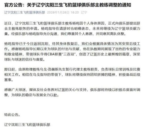 公告內(nèi)容顯示,近日,遼寧沈陽(yáng)三生飛豹籃球俱樂(lè)部主教練楊鳴因個(gè)人身體原因,正式向俱樂(lè)部提出辭去主教練職務(wù)的申請(qǐng)。楊鳴指導(dǎo)在請(qǐng)辭時(shí)也明確表態(tài),未來(lái)將繼續(xù)為遼寧籃球貢獻(xiàn)力量。楊鳴指導(dǎo)已于今日返回沈陽(yáng),待其身體恢復(fù)后,我們會(huì)根據(jù)具體情況為其安排后續(xù)工作。即日起,由原助理教練烏戈·洛佩斯先生暫行代理主教練職責(zé),負(fù)責(zé)球隊(duì)日常訓(xùn)練及比賽相關(guān)工作。